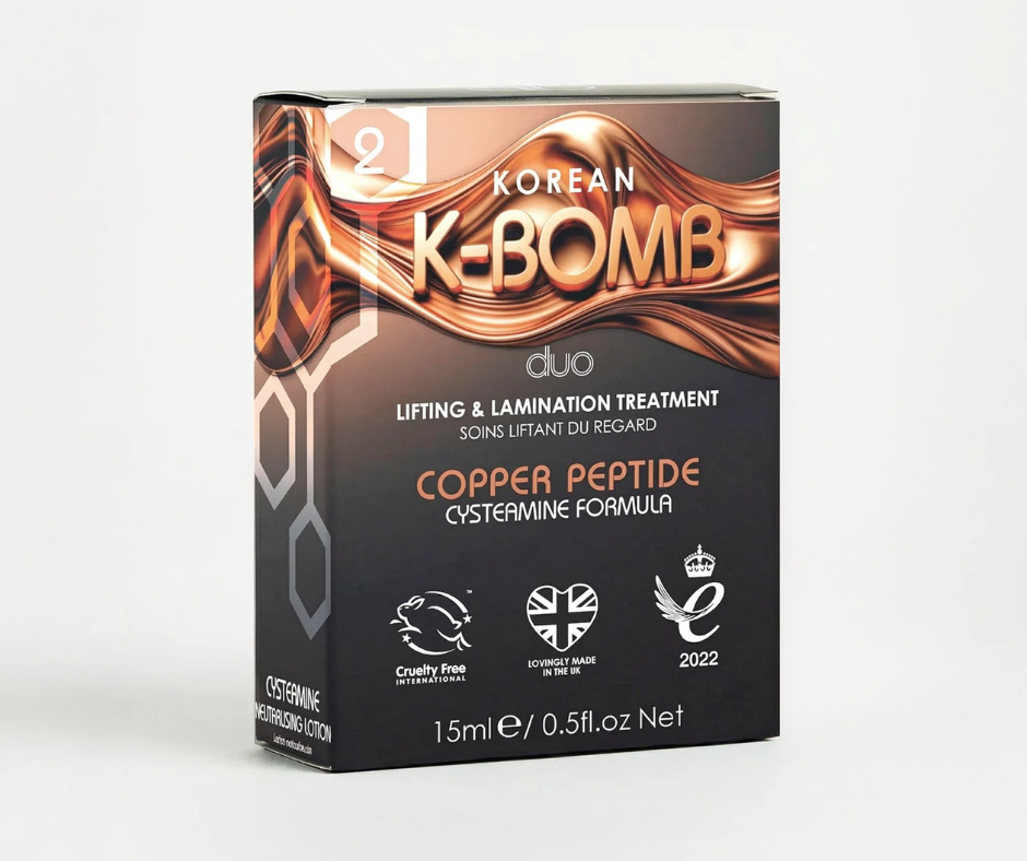 K-Bomb, vyvinutý s ohľadom na zdravie obočia a mihalníc, je napustený inovatívnym komplexom medených peptidov, ktorý posilňuje obočie a mihalnice počas ich spracovania 😍 Je klinicky dokázané, že medené peptidy: